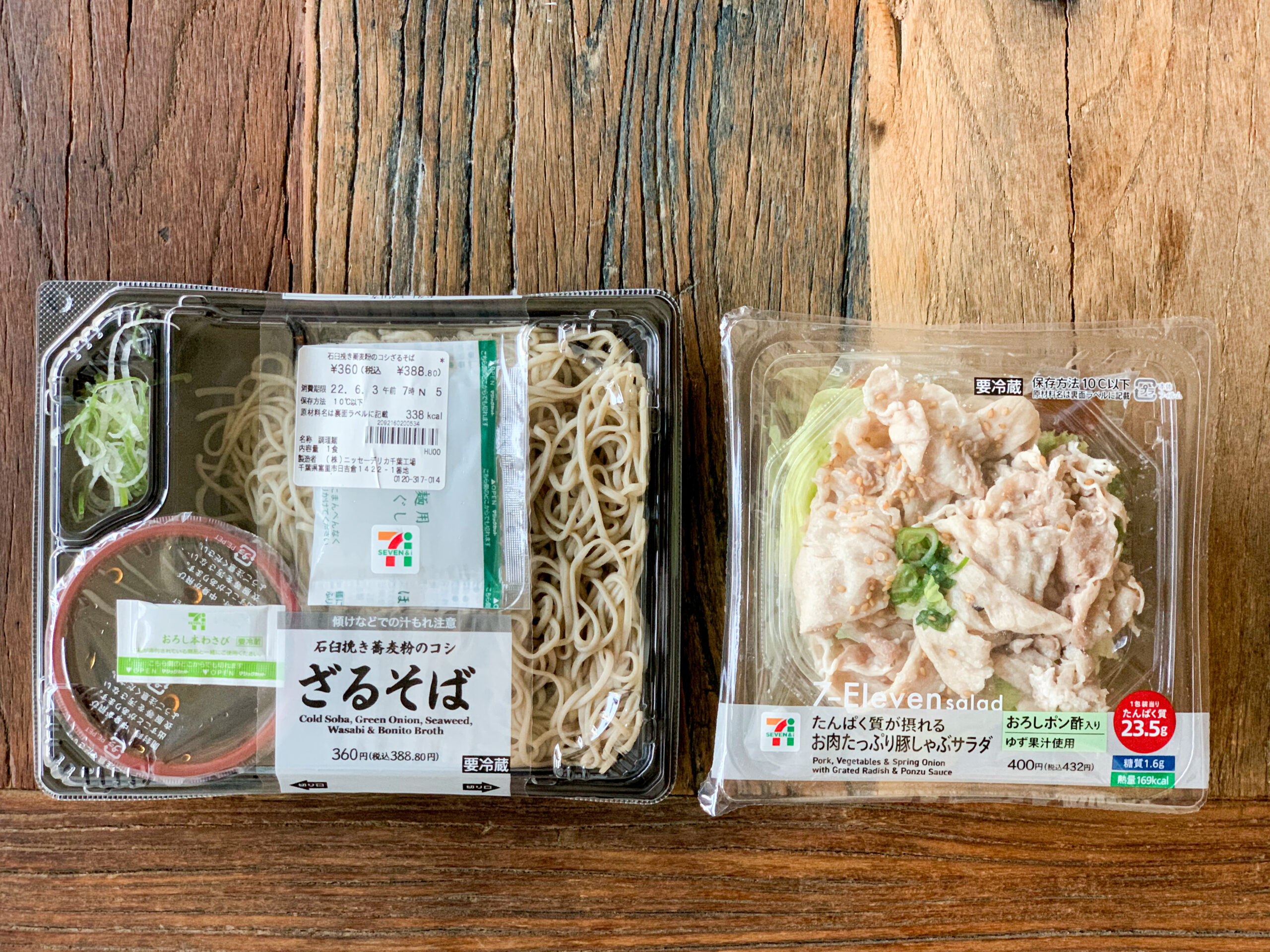 セブンイレブンの「タンパク質が摂れるお肉たっぷり豚しゃぶサラダ」×「ざるそば」。蕎麦に豚しゃぶサラダを加えてよりヘルシーでお腹が満足のいく一品に!<所要時間:1分>